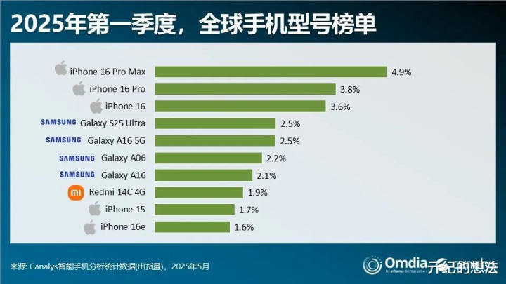 排名第一的是小米,它的市场份额为30.68%,约等于第二名和第三名之和,说一句遥遥领先不过分吧。小米公司的使命是让全球每个人都能享受科技带来的美好生活,看到这样的榜单和成绩,是不是和小米公司的使命相吻合。在这个价位段小米手机中,最具代表的产品是红米14C,同时该机也是2025年Q1全球智能手机畅销榜中唯一的国产手机。